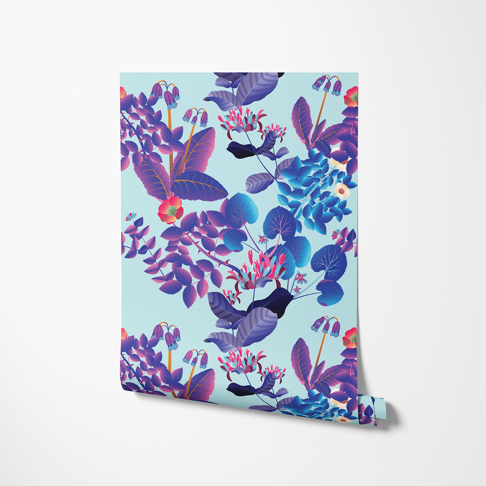 Floral wallpaper in vibrant electric blue, buttercup yellow, and soft day-glow tones. Airy and uplifting—ideal for nature-lovers seeking bold colour.
