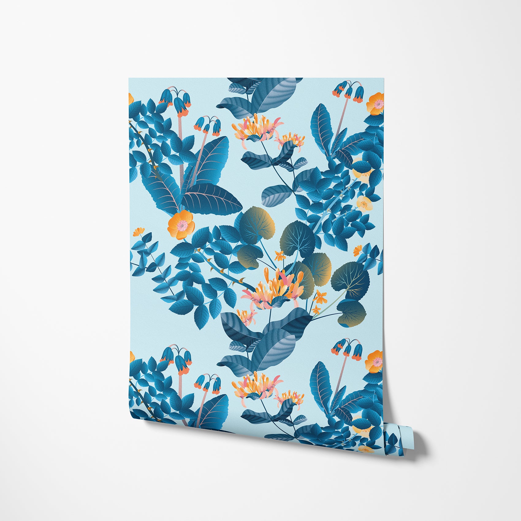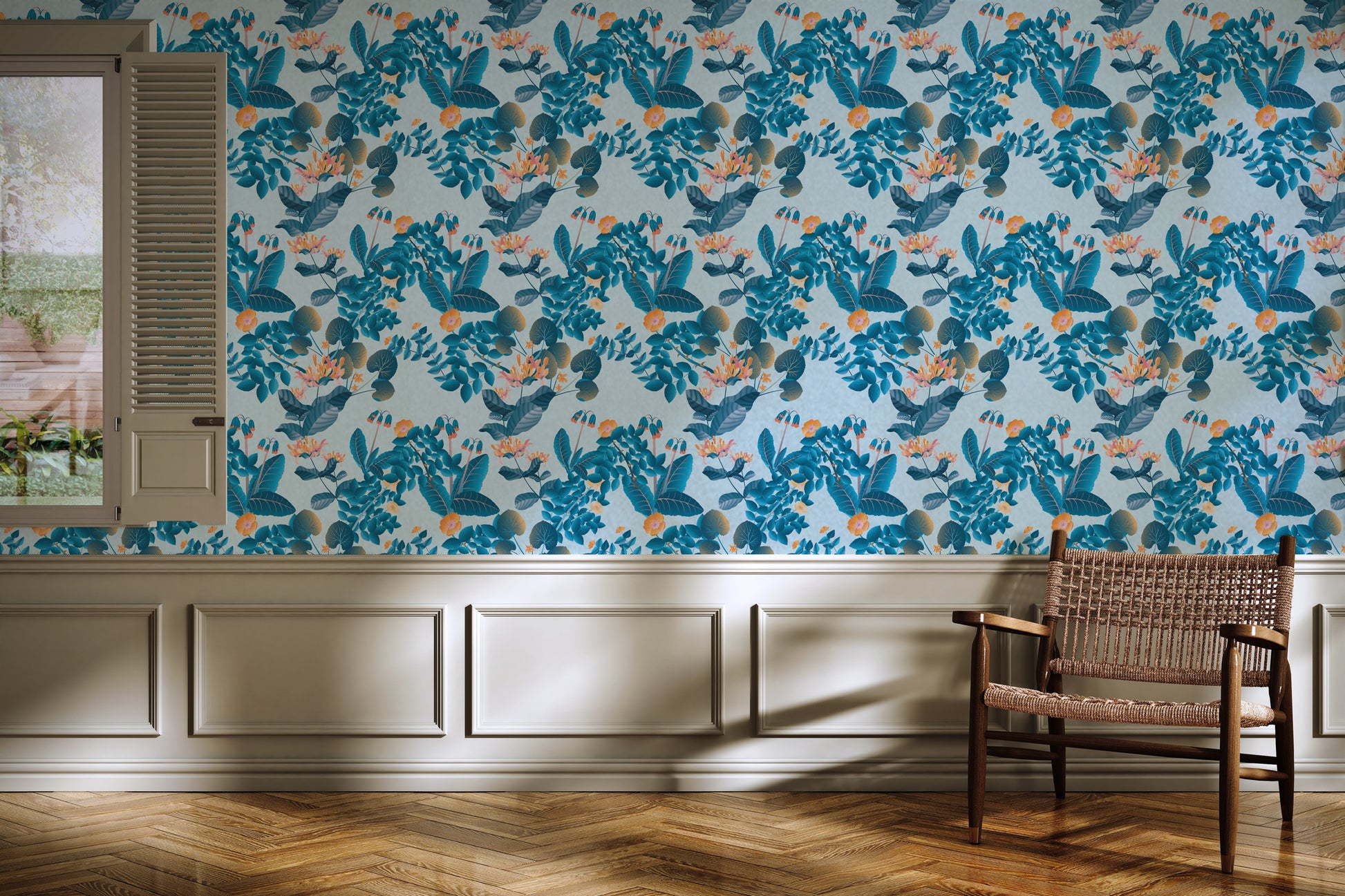 Floral wallpaper in regal blue, orange, and golden hues. Light and serene, this design is inspired by Shakespeare’s magical forest and perfect for bright interiors.
