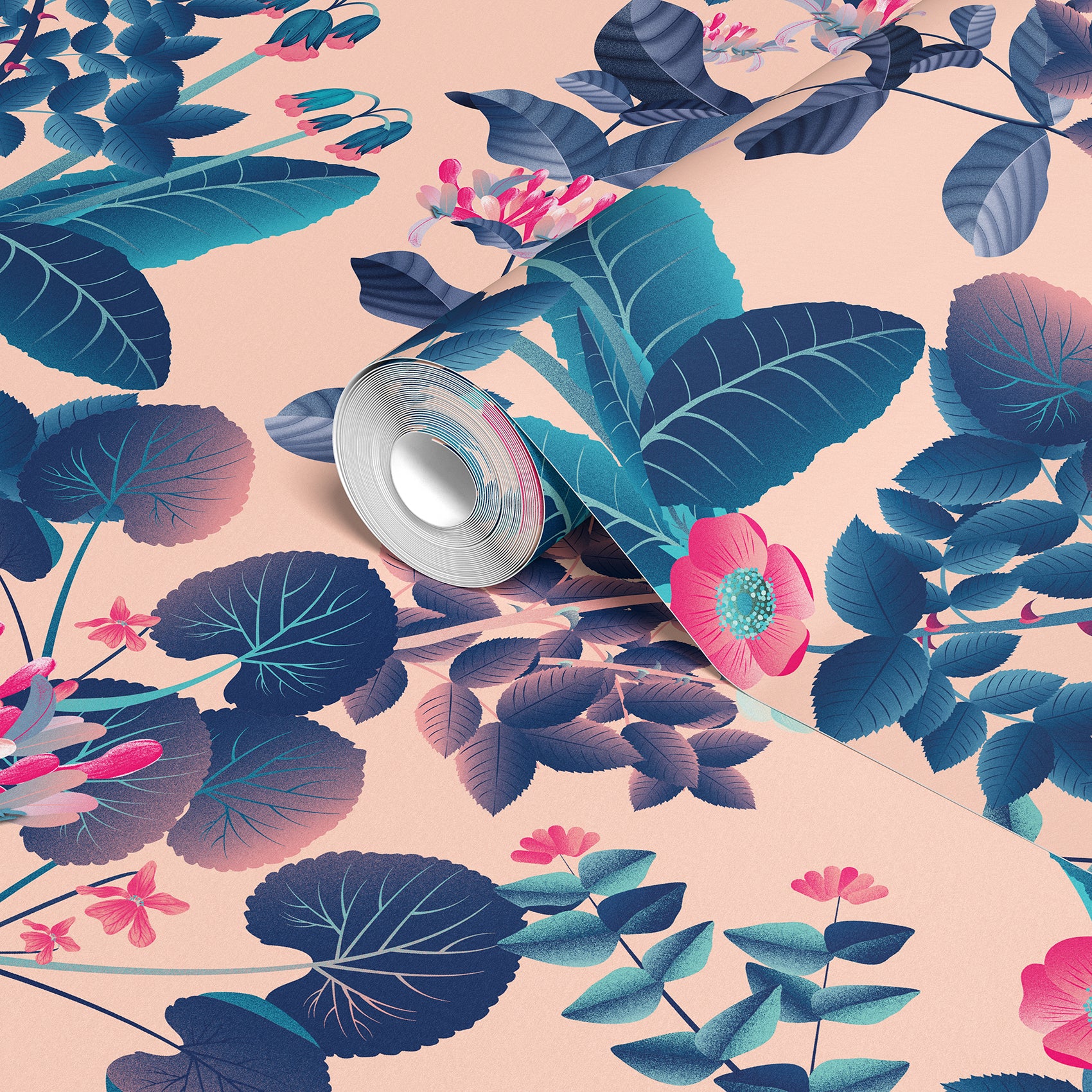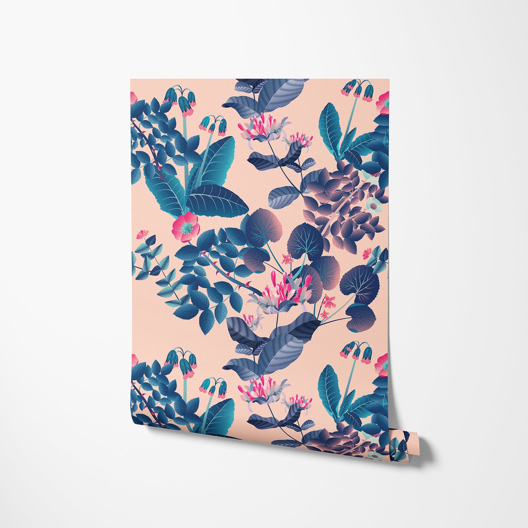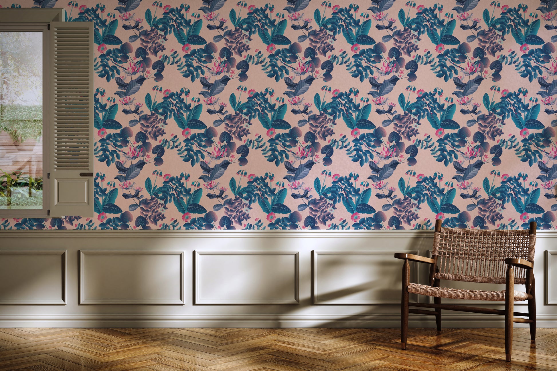 Floral wallpaper in ruby red, turquoise, and soft blue tones. A serene daytime look that blends classic and contemporary botanical style.